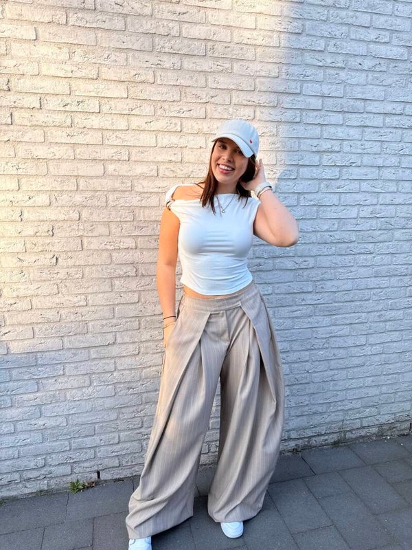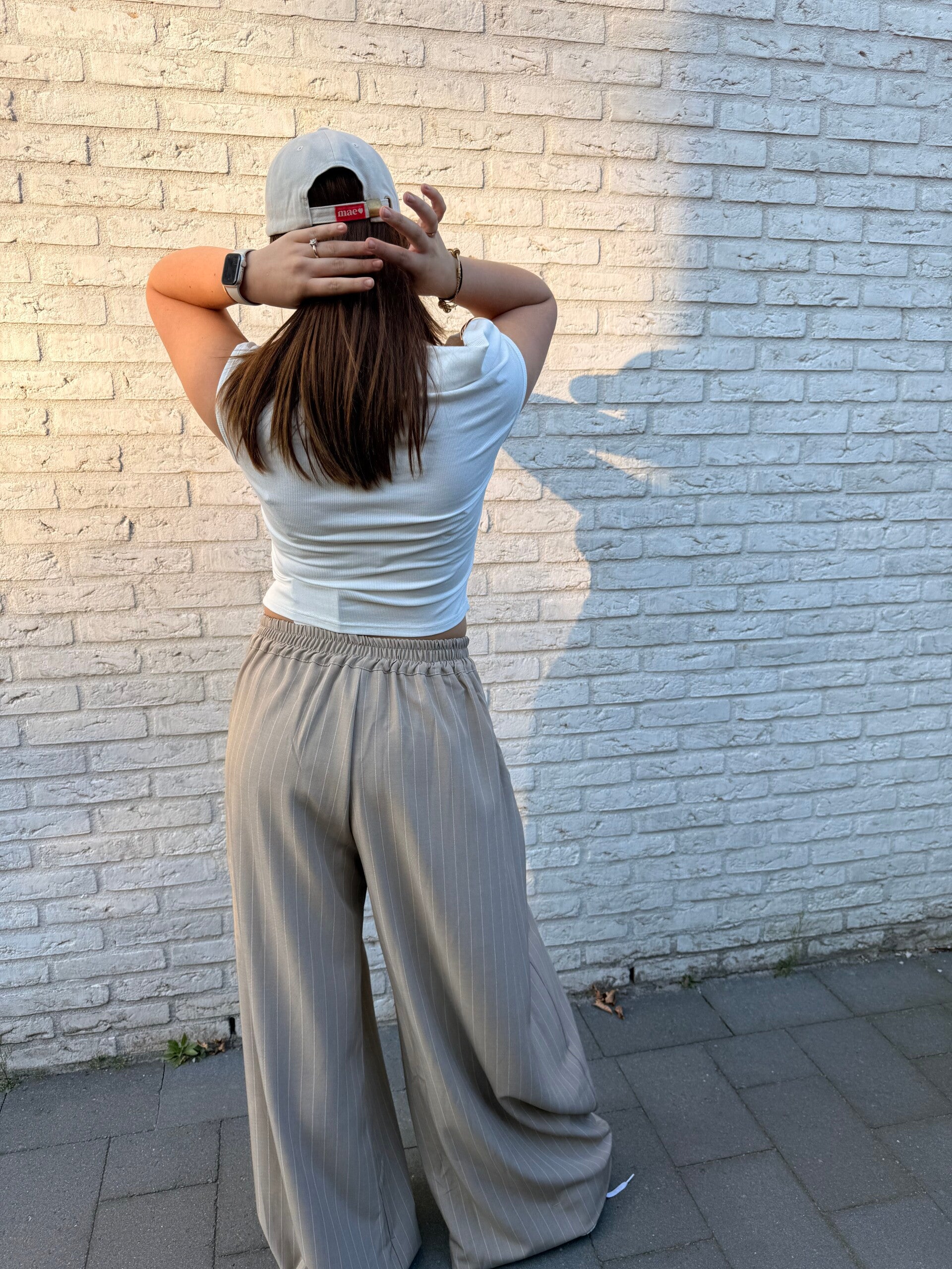 Elegante wide leg pantalon met subtiele krijtstreep en stijlvol overslagdetail aan de voorkant. De pantalon heeft een hoge taille en een soepelvallende fit. Perfect te combineren voor zowel een casual als classy look.